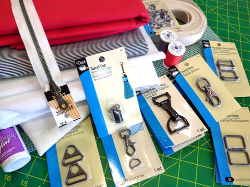 NOTE: You will end up with two large D-Rings (from the Large Hook & D-Ring sets for the adjustable strap) and one small D-Ring (from the Small Swivel Hook set for the tassel) as leftover hardware. Keep them handy in your stash; D-Rings are one of the most flexible pieces of hardware for all kinds of straps, handles, and more. - ONE 24” zipper; we recommend a heavy duty metal zipper to coordinate with your hardware for the best look