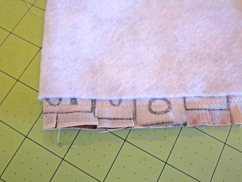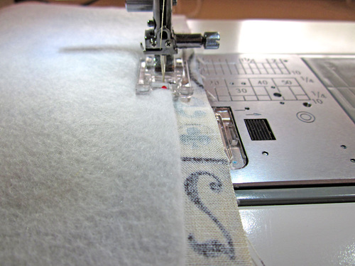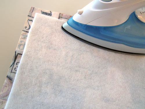 - Following manufacturer’s instruction, adhere the fusible fleece to the wrong side of the exterior panel. There should be ½” of fabric showing beyond the fleece on all sides.