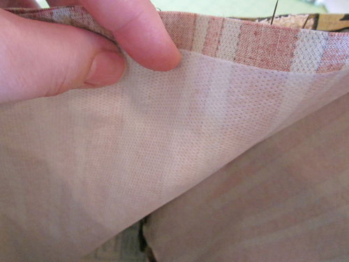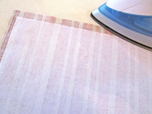 - Adhere the lightweight fusible interfacing to the wrong side of the lining panel. As above, there should be ½” of fabric showing beyond the interfacing on all sides.