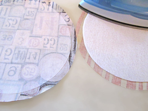 - Center the extra firm fusible interfacing circle on the wrong side of the exterior base and the lightweight fusible circle on the wrong side of the lining base. There should be ½” of fabric showing beyond the interfacing all around. Following manufacturer’s instructions, fuse both in place.