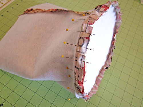 - Place the base right sides together with circular bottom opening of the tube, aligning all the pin points. Easing the fabric, fill in the rest of the circle with pins. If you have done garment sewing, this is very similar to putting in a sleeve.