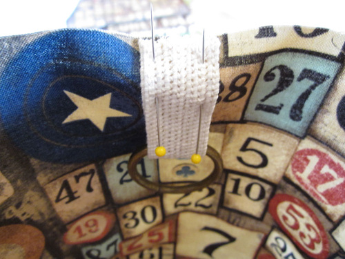 - Pin the webbing in place on the top raw edge of the exterior basket directly opposite the seam.The ends of the webbing should be flush with the top raw edge of the fabric.