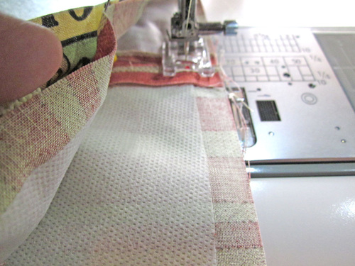 - Stay stitch along the bottom 26″ side of the exterior panel ½” in from the raw edge. Our exterior prints are directional, so the bottom edge is obvious. If your print isn’t directional, simply pick one side that will become the bottom edge.