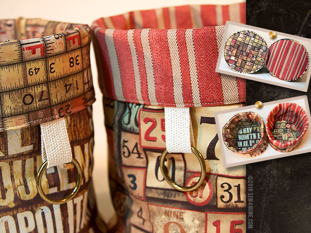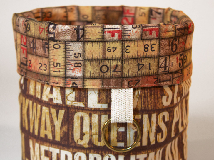 The fold-over cuff is also a great way to showcase coordinating fabrics. As mentioned above, we added a loop and metal ring to the cuff to use as a “drawer pull,” allowing you to access the baskets when lined up on a shelf. You could also use it to ID the basket contents, clip on a key to keep it handy, or attach a gift tag.