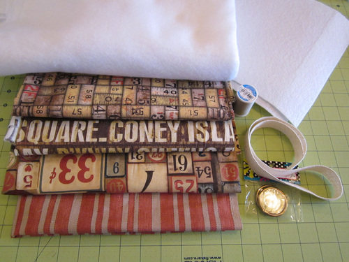 - ½ yard of 44-45″ wide cotton for the exterior sides and the lining base; we originally used Game Pieces in Neutral and Subway Signs in Neutral from the Eclectic Elements Collection by Time Holtz for FreeSpirit Fabrics