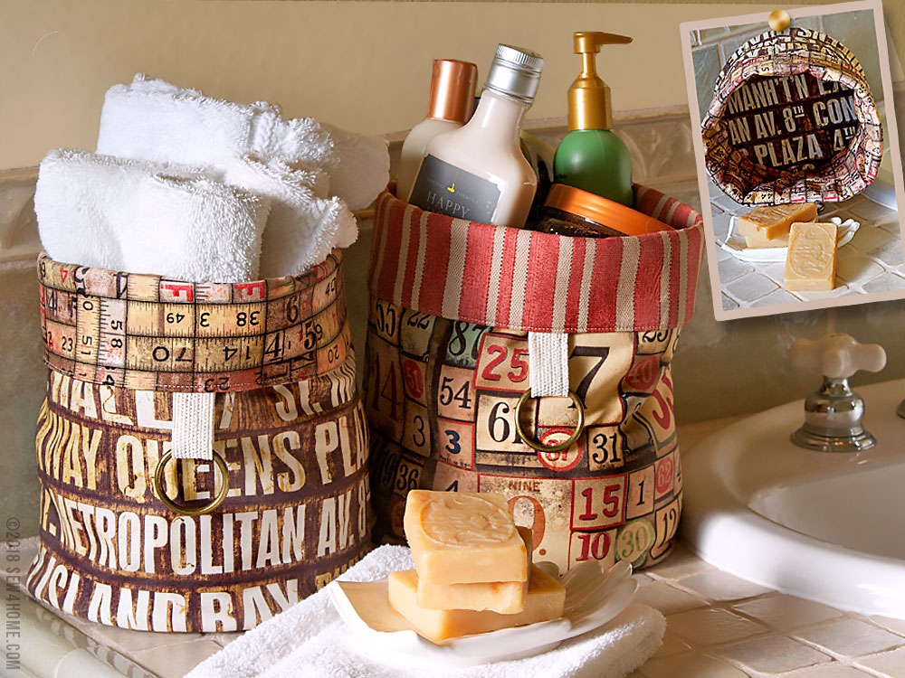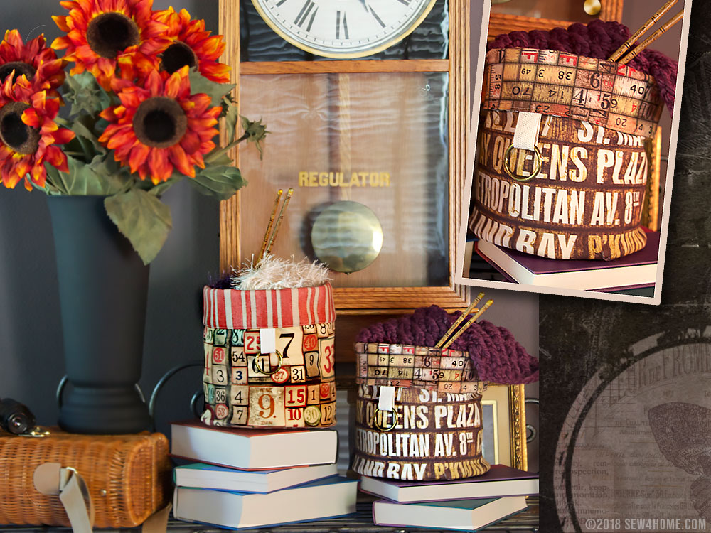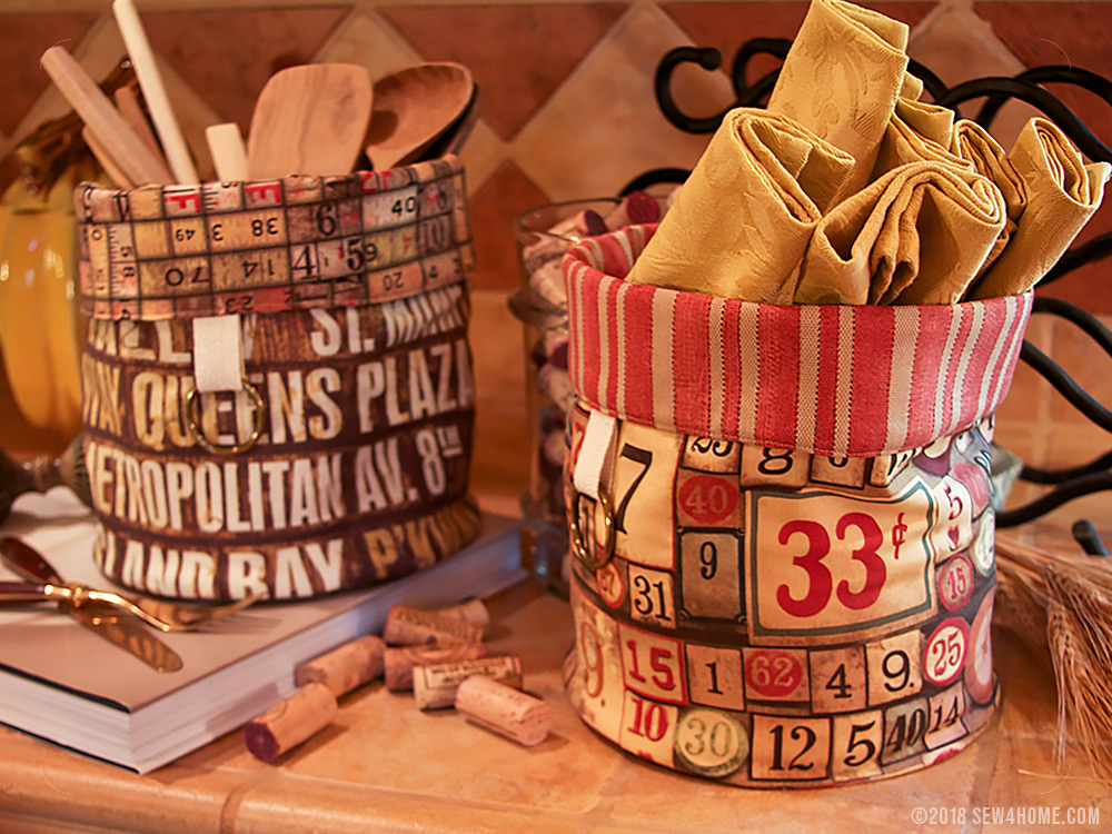 The baskets are stabilized with a trio of products: fusible fleece for the sides in combination with a lightweight interfacing for the lining. The base uses a heavy-weight interfacing panel for extra stability. When finished, they are meant to have a soft slouch – perfect for the antique look of the fabrics we originally selected from the Eclectic Elements collection by Tim Holtz for FreeSpirit Fabrics.