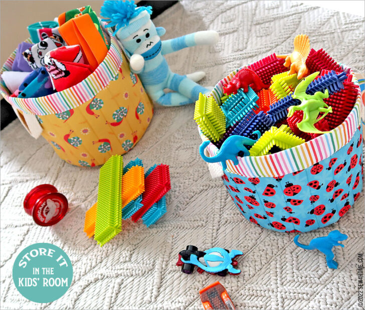 And for our fourth and final set, we went whimsical to create colorful baskets that make picking up after the little ones a bit more fun. Our original fabric picks were from Sunshine Garden for Studio E fabrics – full of bright crayon colors and cute little critters.