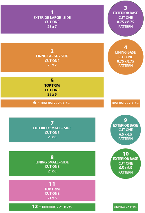 The illustrations below show all the pieces and their cut sizing. By referencing the size of each of the pieces, you can determine the yardage changes necessary should you wish to include fewer fabrics, more fabrics, and/or – as noted above – you need to do some directional fussy cutting.