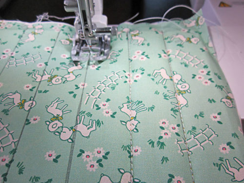 - Re-set for a slightly lengthened straight stitch. We used 3.0mm. If possible, attach an Even Feed/Walking foot or engage your machine’s built-in fabric feeding system. This will make quilting through these thick layers much easier and more precise.