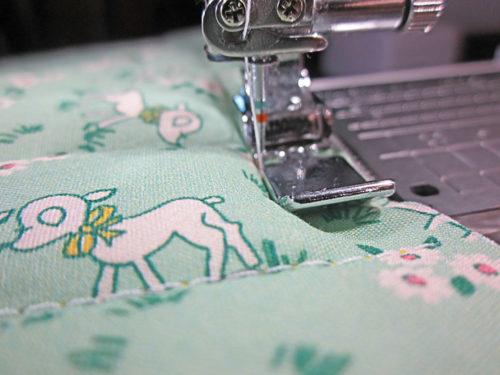 - Using a Zipper foot, stitch around the circle through all the layers TWICE. The first time around is to set the layers in place – this seam can be a bit messy. The second time around, stitch right up against the foam, snugging up to create a smooth seam all the way around. Go slowly and carefully; slow and steady wins the race.
