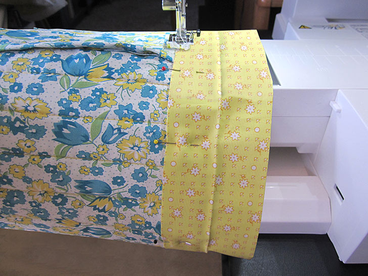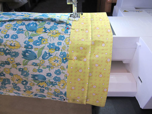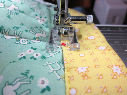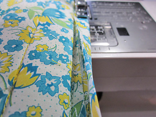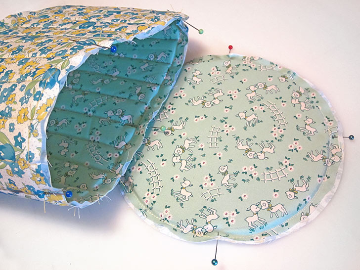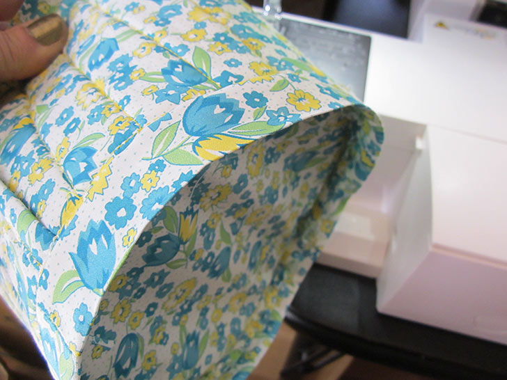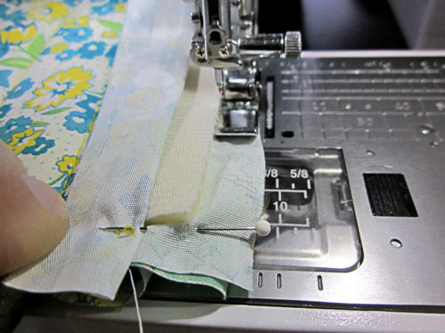 - The lining edges are wrong sides together, sandwiching the exterior layers. Pin in place and once again stitch the short seam. And (let’s say it all together now) run the seam right along the edge of foam.