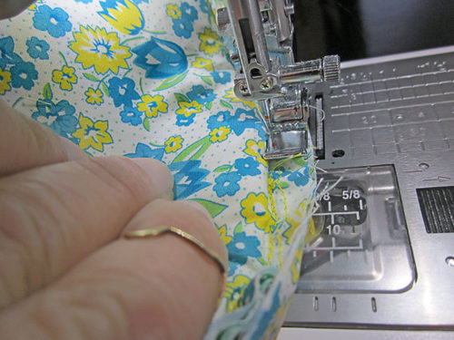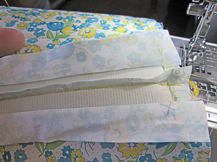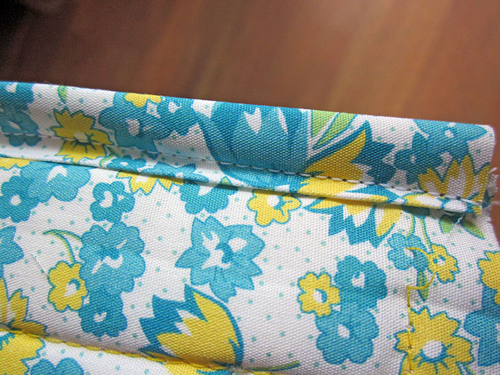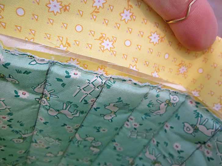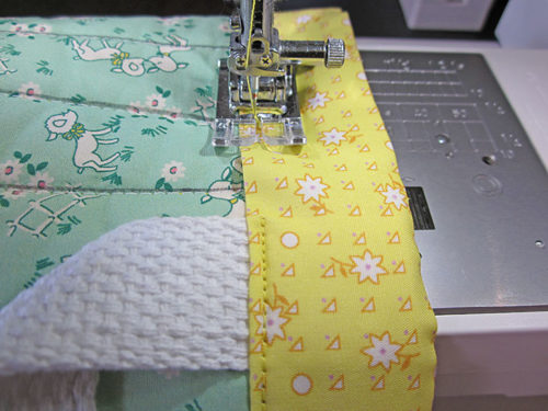 - Stitch in place all around through all the layers to secure the bottom edge of the binding and to secure the handles in position. This seam should run very close to the bottom fold of the binding, about ⅛” is recommended.