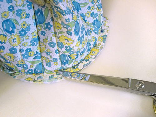 NOTE: This technique is the same as any project where you are inserting a flat circle into a tube. If you are new to this process, check out our full step-by-step tutorial. - Carefully snip into the seam allowance of the tube (not the base) so it can flare out slightly to better match the circular base. Looking down from the top with the layers pinned in place, it looks a bit like a flower pot.