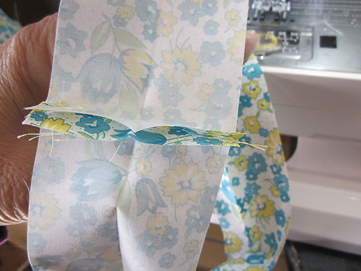 - Press open the short seam allowance, then re-fold the binding strip wrong sides together.