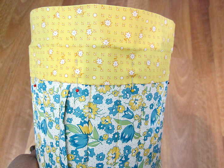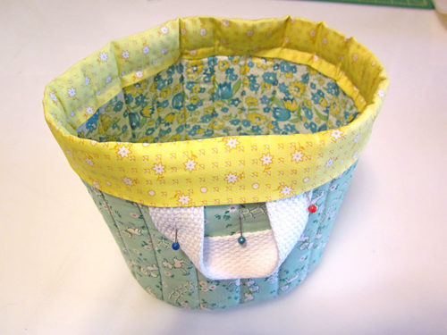 - Slip the folded binding strip over the body of the basket, sliding it towards the bottom until the raw edges of the folded strip are flush with the raw edges of the base seam allowance. The seam of the binding strip should be aligned with the side seam of the body of the basket. Pin in place.