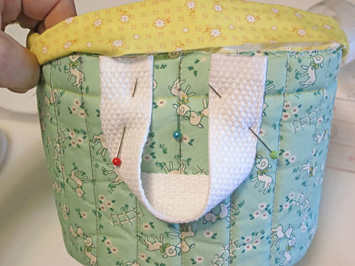 - The seam should now be considered the back of your basket. Using this as your guide, you can measure from the seam to the right and to the left to evenly position a handle at each side. The raw ends of handles should be flush with the top raw edges of the basket. Pin the handles in place.