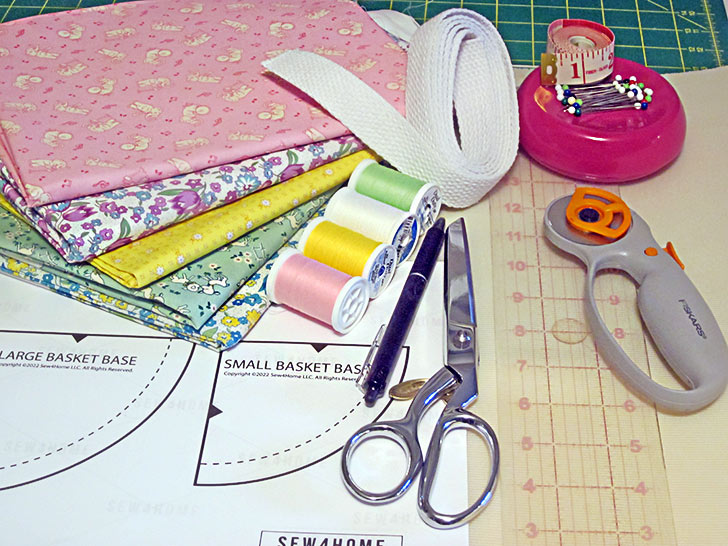 - Fabric C (small basket exterior and base: #7, #9): ½ yard of 44″+ wide quilting weight fabric; we originally used Tossed Baby Lambs in Green