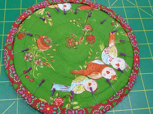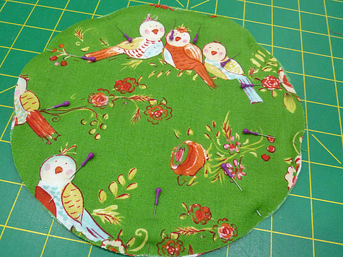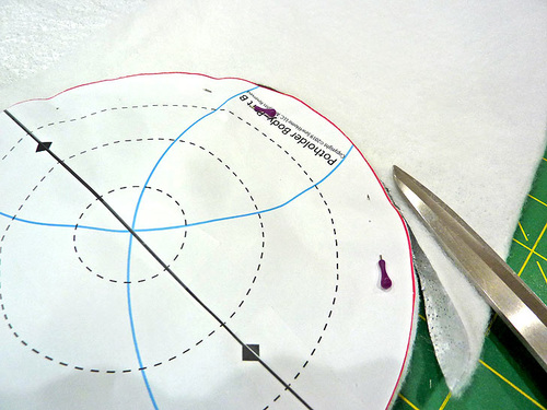 - Place the paper pattern over the top of the quilted circle. If you have a directional motif, make sure that motif is aligned with the paper pattern. Pin the pattern in place.