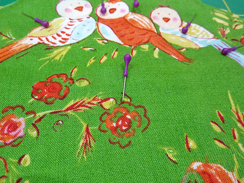 One of the especially cute elements of this design is how a featured motif peeks out from the overlapping petal pockets: a sweet trio of birds on one and a gorgeous floral bloom on the other. This is an excellent example of the power of fussy cutting. It does take a bit more fabric, but the end result is worth it.
