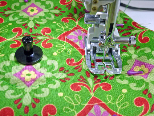 - Using a ½” seam allowance, stitch the binding in place through all the layers along the top curved edge.