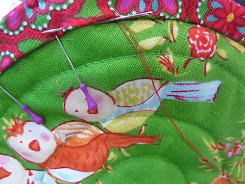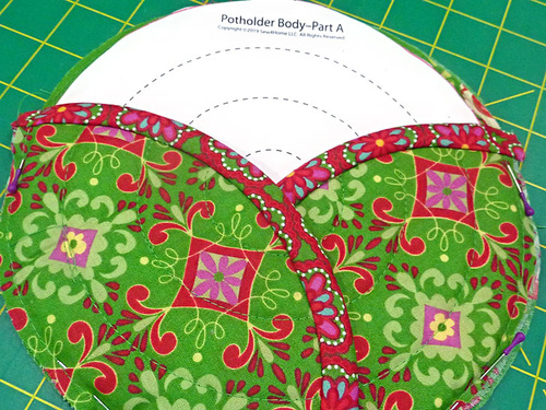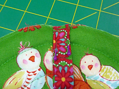- Machine baste around the entire perimeter of the potholder, following along in the outermost quilting circle. This secures the outer edges of the petal pocket panels and secures the hanging loop into position.