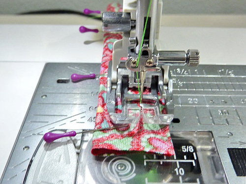 - Find the 5” length of binding. Fold it in half, right sides together and pin along the 5” side.