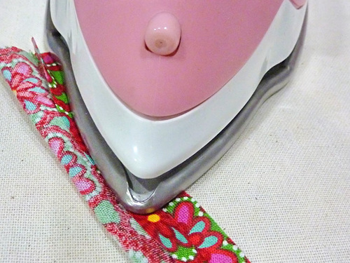 NOTE: Remember, as listed above, you need TWO 8” lengths for the pockets, ONE 5” length for the hanging loop, and ONE 27” length for the outer perimeter. - Fold each binding length in half, wrong sides together, and press to set a center crease line.