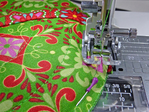 - With the ends finished and the binding completely pinned in place, use a ½” seam allowance to sew all the way around through all the layers.