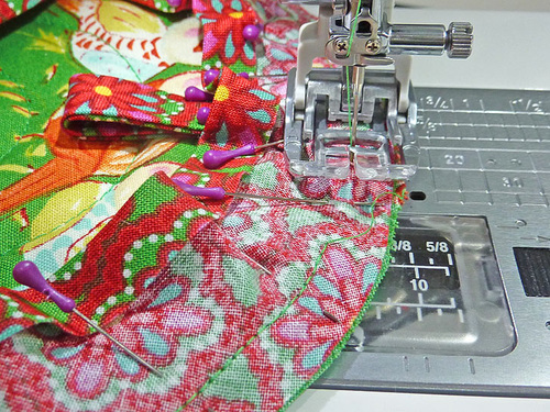 NOTE: We allowed the folded edge of the binding strip to un-fold during the pinning as it was easier to ease the binding along the curve without the stiffness of that fold. You can do the same or leave it folded. The result is the same.