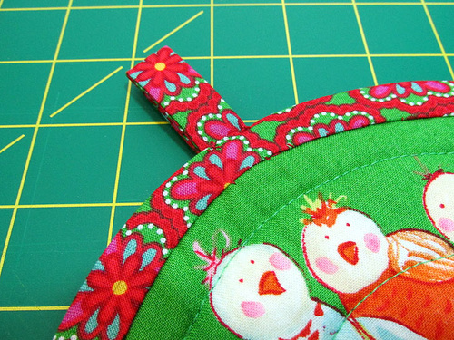- Pull the hanging loop up into position. Hand tack or run a machine stitch across the base, in line with the top of the binding, to hold the loop in its upright position. We hand tacked our loop on the back of the potholder.