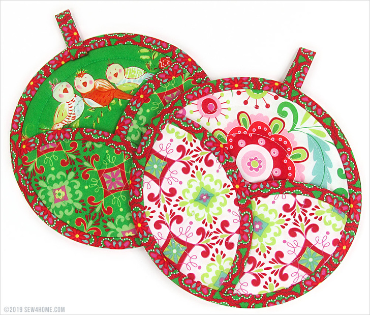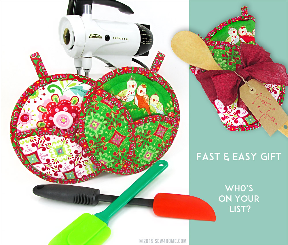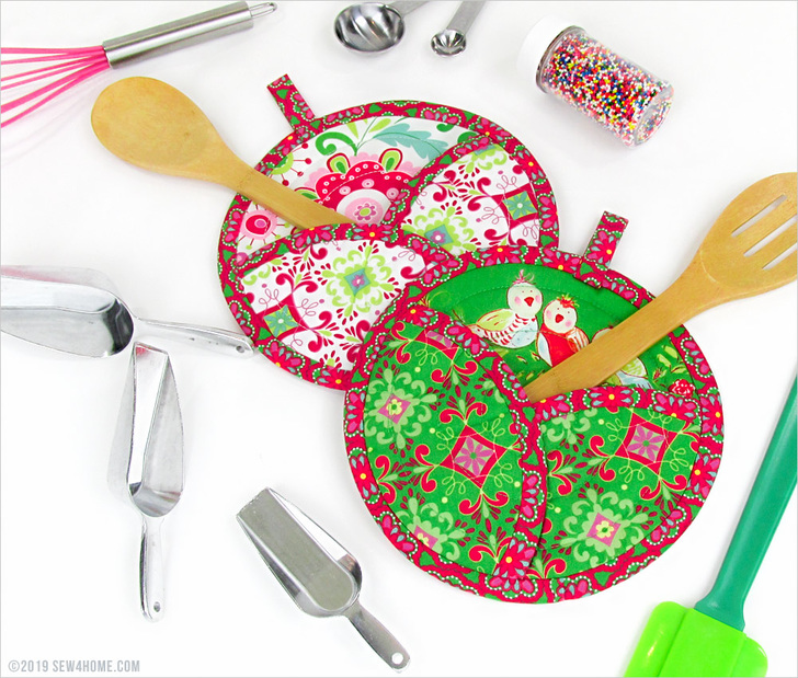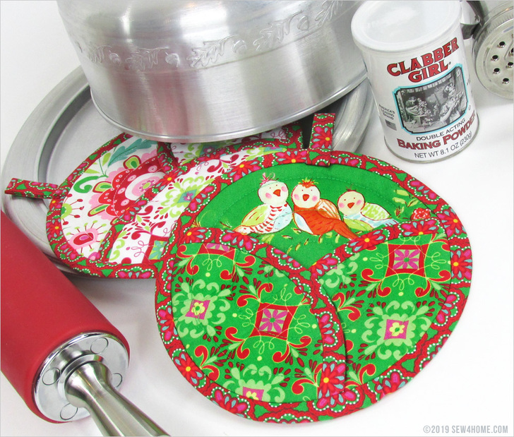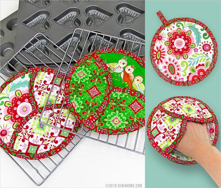These potholders would make a wonderful gift idea. Bundle up one or more with a few kitchen gadgets, a cookbook and/or your own homemade sweet treats. Our sample potholders have a holiday flair, but the shape and style works throughout the year – just swap out your fabric choices to match the season or occasion.