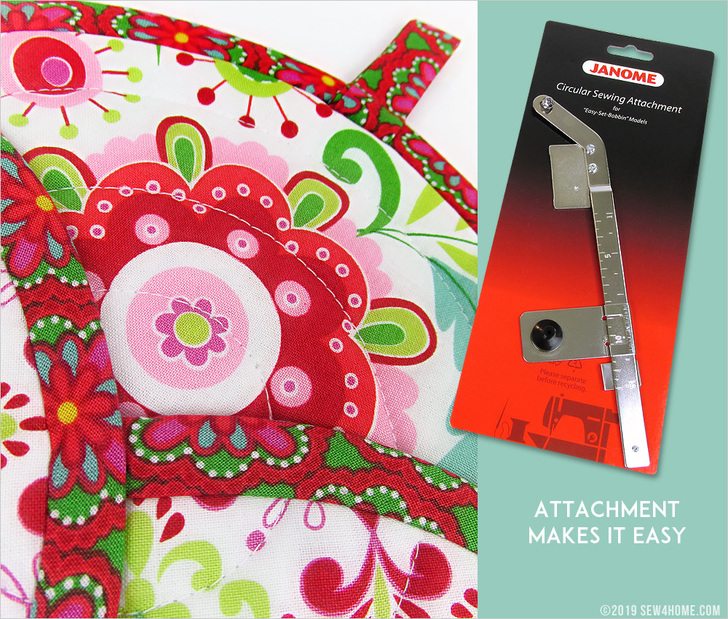 If you’re brand new to this attachment, take a look at our full, step-by-step tutorial that shows how to set-up and stitch, using a simple straight stitch as we did with these potholders or a series of decorative stitch rings. There are multiple versions of the tool to fit all the different Janome models. Check with your local Janome Dealer to confirm you get the right size Circular Sewing Attachment for your machine.