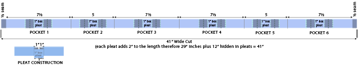 - Place the pocket panel right side up and flat on your work surface to make SIX 1″ box pleats along the bottom edge.
