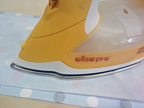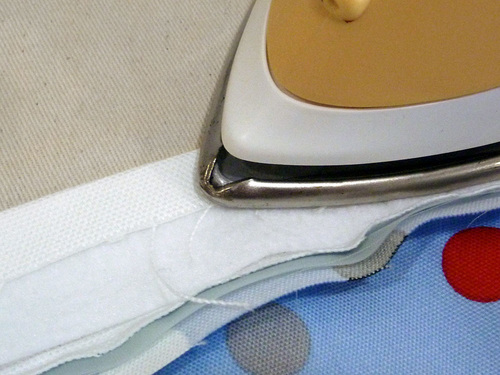 - Unfold again, wrong side up, and slip the interfacing strip into place along one half of the handle. It should sit in between the center fold and one edge fold. Following manufacturer’s instructions, fuse the interfacing in place.