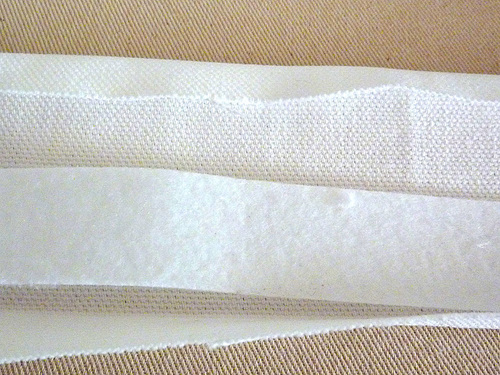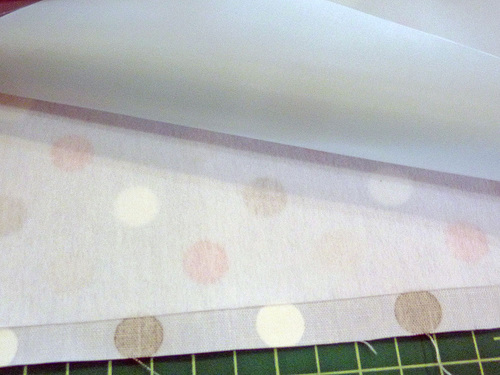 - Find the 40″ x 1″ heavy-weight interfacing strip. Slip in into place under the folded edge of the trim strip. The edge of the interfacing should sit right up against the fold; its opposite edge will come almost to the seam line, and there should be ½” of fabric extending beyond the interfacing at each end. Following manufacturer’s instructions, fuse the interfacing in place. Be careful to not touch the hot iron against the nylon lining fabric.