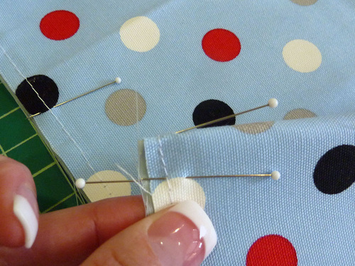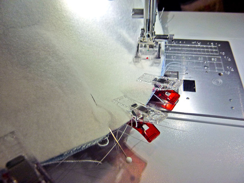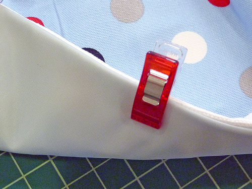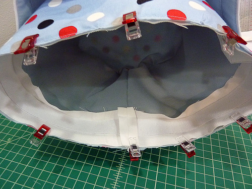 - Pin at the quadrant points first, then fill in around the circle. Don’t be afraid to use a lot of pins or clips in order to get the two pieces to lay flat against one another. This technique is the same as any project where you are inserting a flat circle into a tube. If you are new to this process, check out our full, step-by-step tutorial.