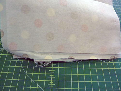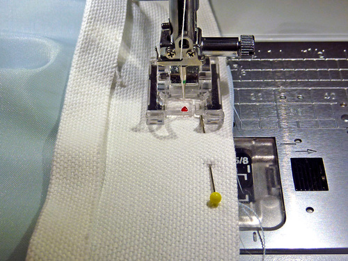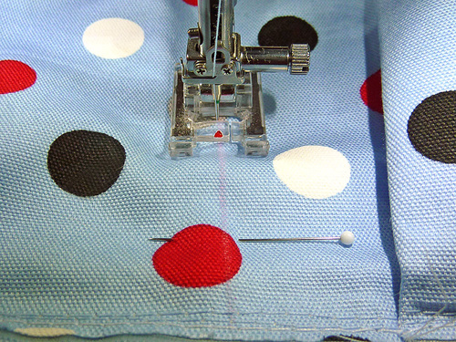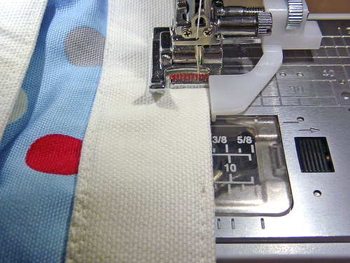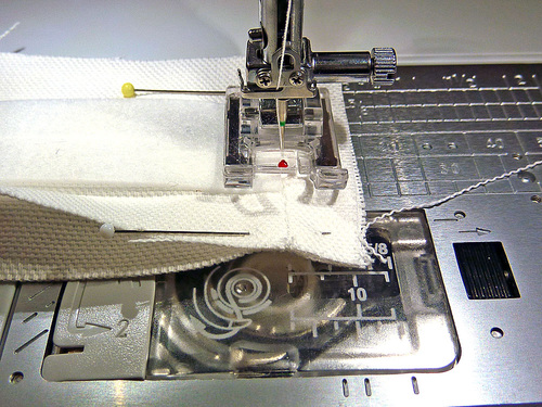 - Machine baste the layers together around the top. As with the pocket panel, this basting seam helps keep the nylon lining from slipping around during the rest of the construction. If your machine has a free arm, now is a good time to use it.