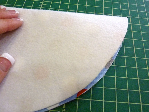 - Find the exterior base circle and the heavy-weight interfacing circle. Place the interfacing against the wrong side of the fabric. Following manufacturer’s instructions, fuse the interfacing in place. With this type of heavy interfacing, it’s usually best to fuse from both sides.
