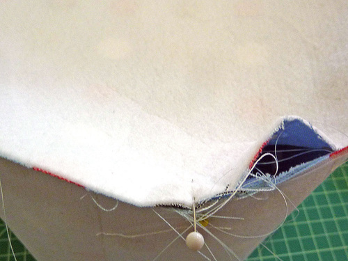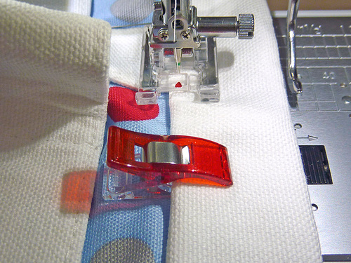 - Bring the trim strip up and over to the front of the pocket panel and pin or clip in place.