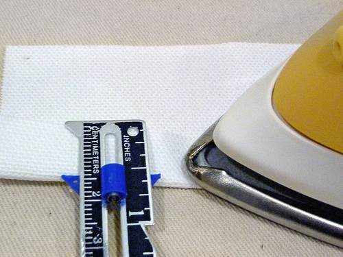 - Find the 21″ x 3″ handle strip and the 21″ x ¾” heavy-weight interfacing strip.