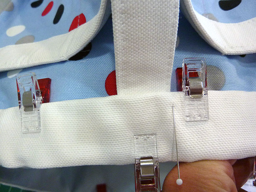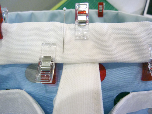 - Find the handle. Insert one raw end under the trim 7″ around the top from the center back seam. Slip the end all the way under until it butts up against the trim’s seam. Pin or clip in place.