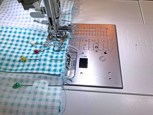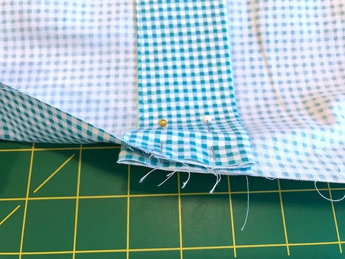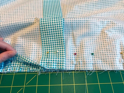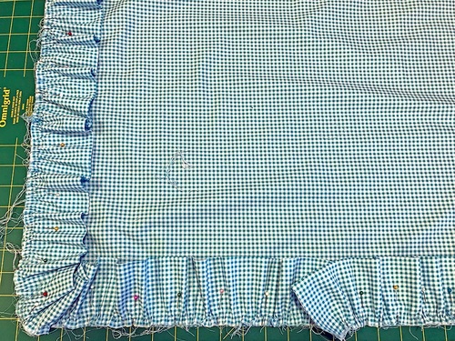 - On the front panel, carefully pin the extra ruffle fabric away from the corners so it does not get caught up in the stitching.