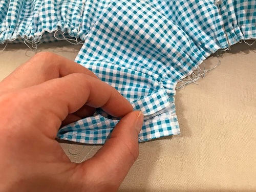 - Pull the ruffle away from the panel just a bit and topstitch the overlap in place.