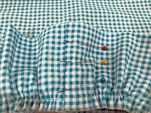 - Place the finished ruffled back against the panel and pin. You should now have a continuous ruffle pinned in place along all four sides. Take another minute to re-adjust the gathers so they are nice and even all around.