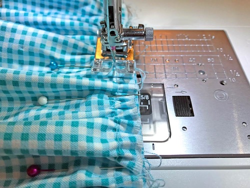 NOTE: This is a lot o’ ruffling – especially if you are doing more than a couple shams. You might want to consider a ruffler attachment. These puppies look a little intimidating but are easy to use; check out our tutorial on the ruffler attachment. If you don’t have a ruffler attachment, you can ruffle the traditional way with one or two lines of machine basting.