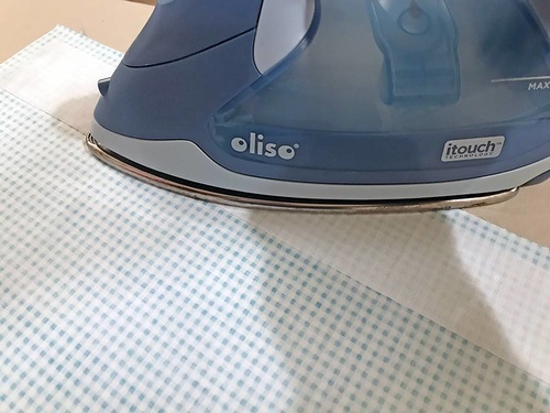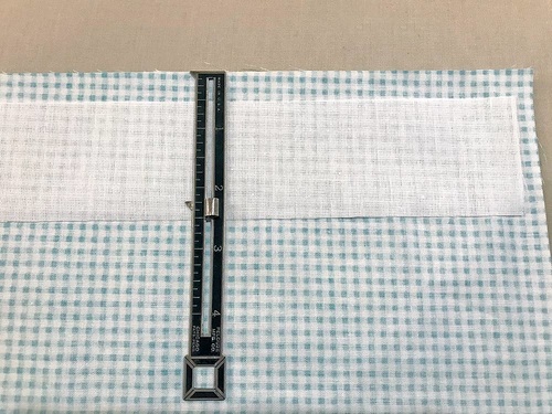- Place an interfacing strip along one 17” side of each panel. If you have a directional print, make sure you place the interfacing along what will become the inside, overlapping edge. The interfacing should sit ½” from the 17” edge and ½” in from the top and bottom of the panel.