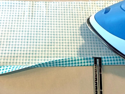 - Find the four 21” x 6” panels, two for each pillowcase. Along one 21” edge of each, create a ½” double-turn hem. To do this, turn under the raw edge ½” and press well. Turn under another ½” and press well again.