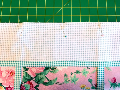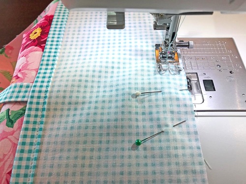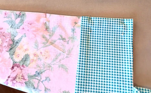 - Find two of the facing panels. Align the 21” raw edge of the each facing panel with each 21” raw edge of the main panel, sandwiching the ties between the layers. Pin in place.