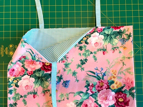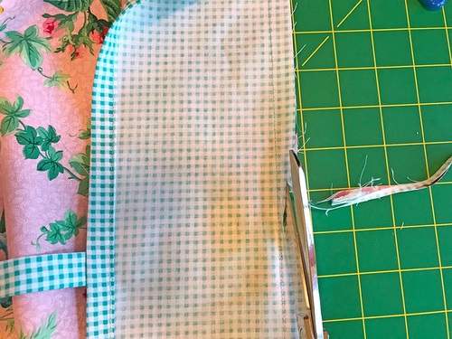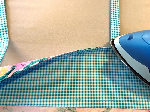 - Fold each facing to the wrong side of the panel so the facings and the panel are wrong sides together. Pull the ties out into position. The seam should be nice and straight along the edge. Press well.