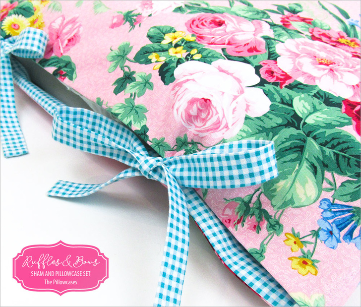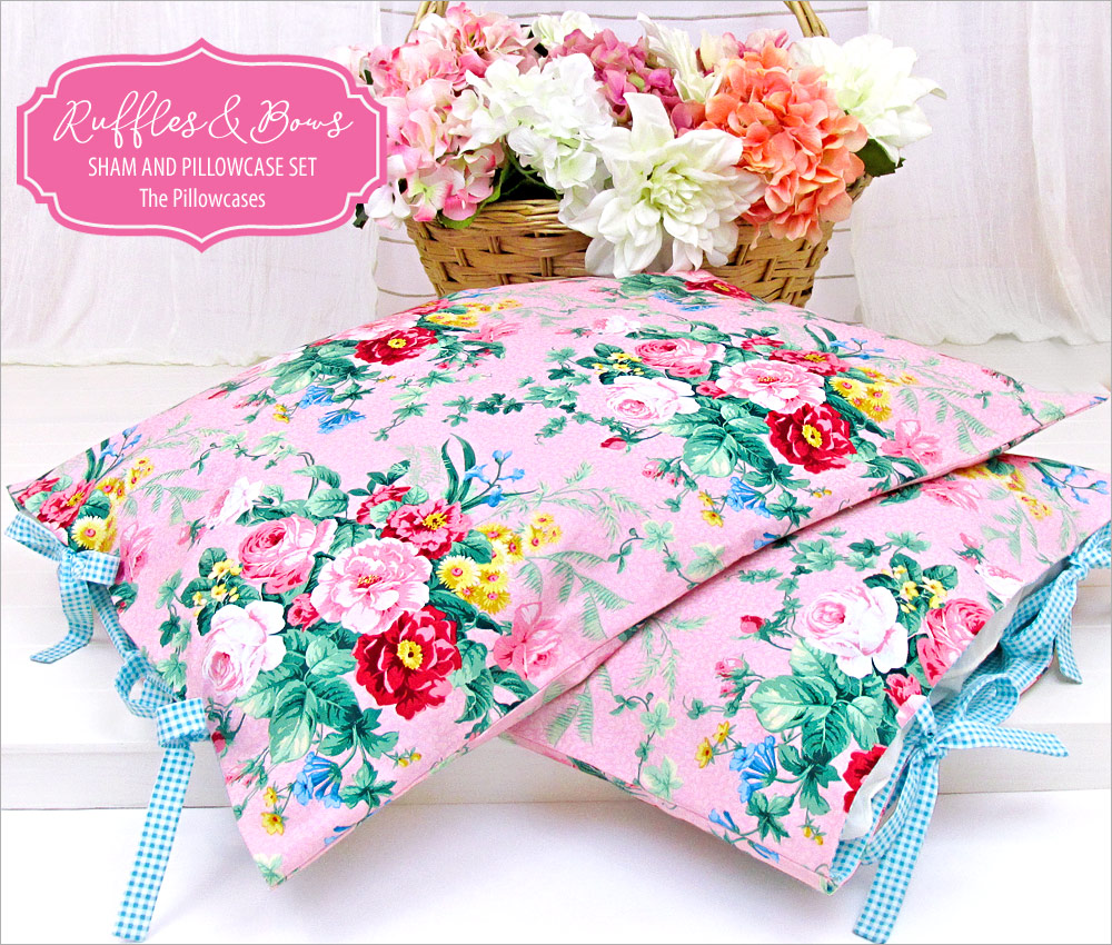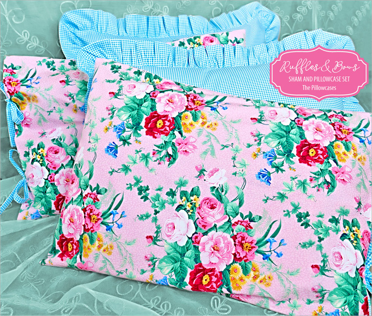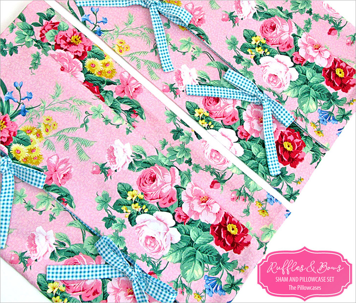 Pillowcases are the #1 project for beginning sewers. We’ve designed a coordinated set of shams and cases, both of which are sized to fit standard bed pillows (20” x 26”). This article includes the steps for the pillowcases with their bold floral fabric, and featuring pretty bow closures and peek-a-boo facings in gingham to match the shams.